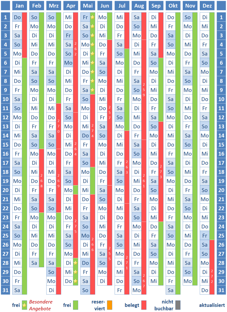 Für Ihre An- und Abreise können Sie jeden beliebigen Wochentag wählen. Sie können uns bei der Planung Ihres Aufenthaltes helfen, wenn Sie keine kurzen Abstände von weniger als 7 Tagen zwischen den Vermietungen frei lassen. - Vielen Dank!